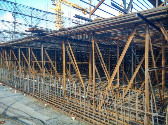在綁底板的同時(shí)做好底板梁的綁扎,即先先綁東西向后綁南北向的方法排列鋼筋。其接頭位置“下層鐵在跨中,上層鐵在支座”。梁板式基礎(chǔ)部位鋼筋接頭必須按50%錯(cuò)開(kāi),要嚴(yán)格按照配料單的順序及位置準(zhǔn)確排放基礎(chǔ)底板下鐵保護(hù)層為40(50)㎜,上鐵為30mm。板上、下鐵中間用馬凳鐵支起,間距800mm,馬凳高度=底板厚-上下保護(hù)層-上層雙向鋼筋直徑-下層單向鋼筋直徑。